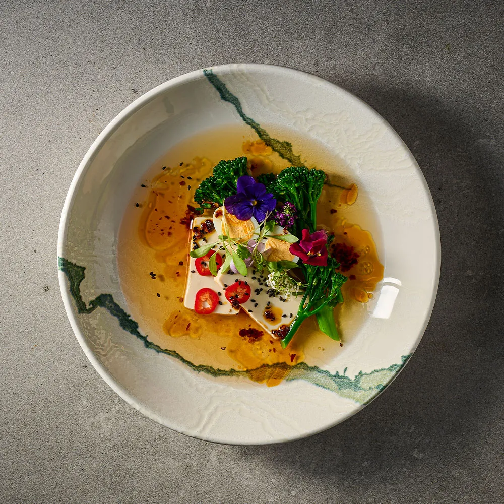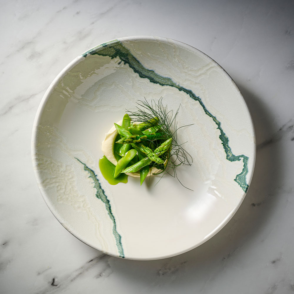Tide Accents ist eine minimalistische Weiterentwicklung des ursprünglichen Tide-Designs. Das ikonische, fließende Muster in Weiß wird durch einen kräftigen, zeitgemäßen Farbakzent aufgewertet – ideal für moderne Anrichtetechniken und Premium-Gastronomie.