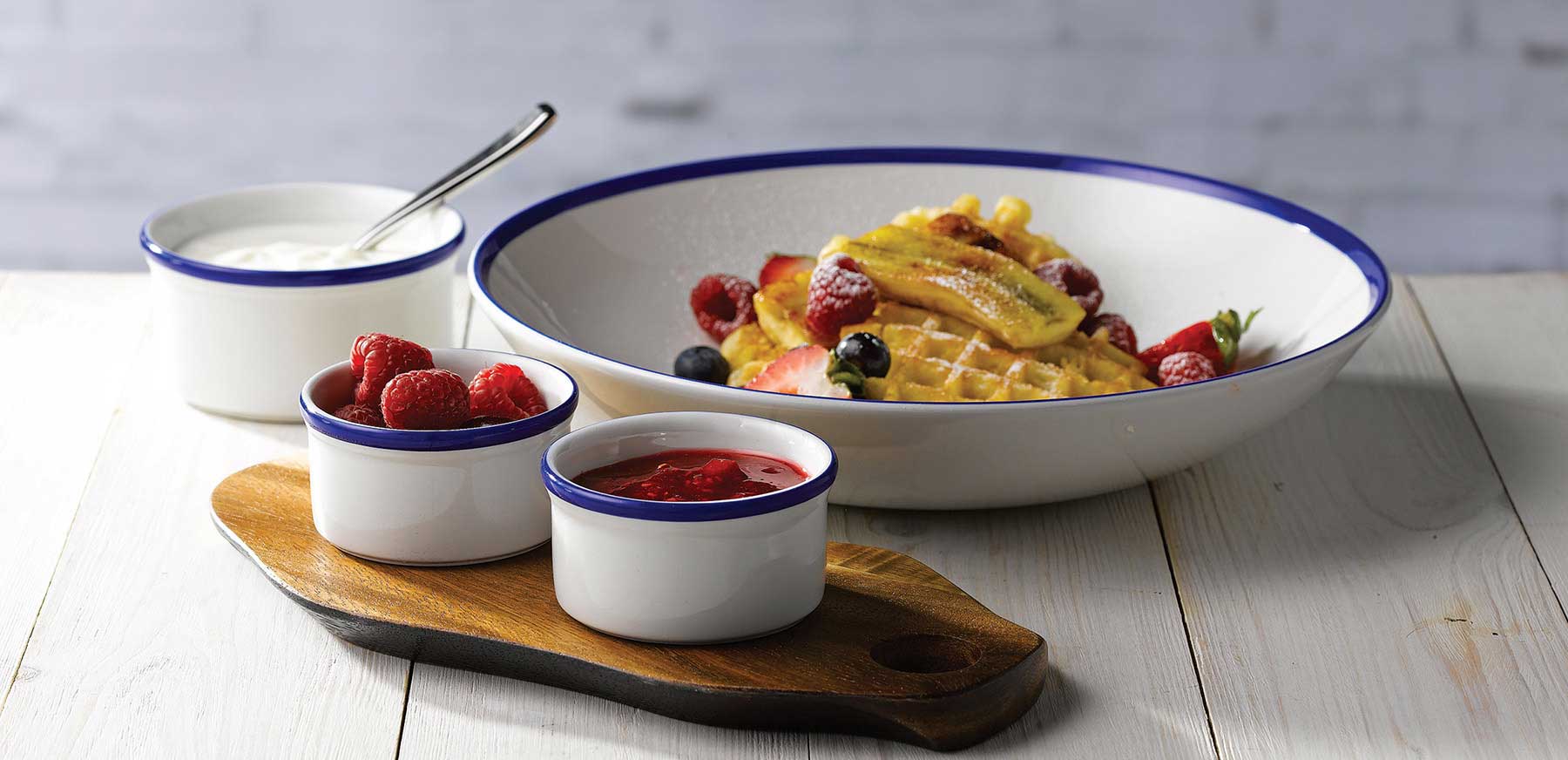 Ungezwungen und nostalgisch Retro Blau zeichnet sich durch einen breiten Rand in Cobalt Blue aus, inspiriert von traditionellem Emaillegeschirr mit allen Leistungsmerkmalen und Food safety-Vorteilen von Keramik.