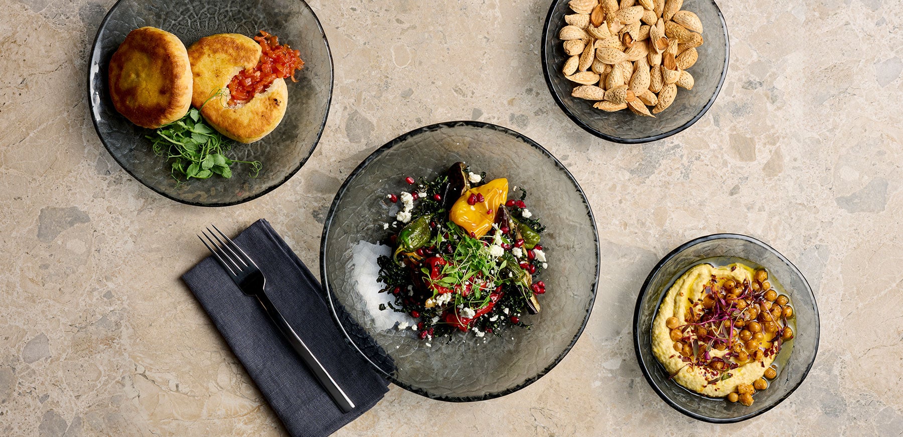 Das Gepräge, das die Viana-Kollektion aufwertet, wird auf Glasgeschirr mit organischen Formen in dem sanften, subtilen Farbton Dusk präsentiert.
